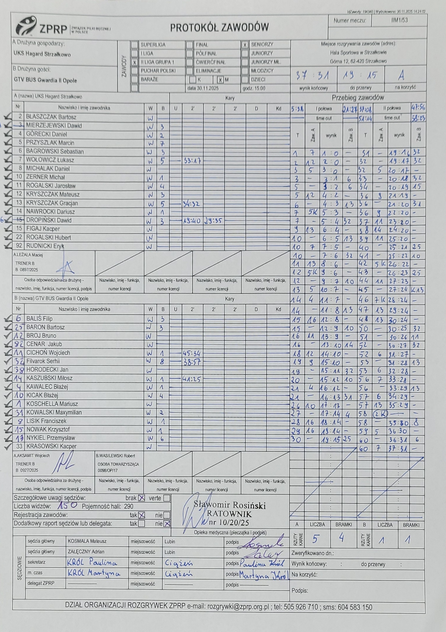 Data Kategoria Zespół 1 Wynik / Do przerwy Zespół 2 Karne1 / Karne2 Sędzia 1 Sędzia 2 12.12.2025 IIM1/66 Acana Moto-Jelcz Oława II :: GTV BUS Gwardia II Opole ()() KOSMALA Mateusz ZAŁĘCZNY Adrian 07.12.2025 IIM1/56 GTV BUS Gwardia II Opole :: KPR ŚRODA WLKP. ()() PARKITNY Adam ZAJĄC Karol 07.12.2025 IIM1/56 GTV BUS Gwardia II Opole :: KPR ŚRODA WLKP. ()() PARKITNY Adam ZAJĄC Karol 30.11.2025 IIM1/53 UKS Hagard Strzałkowo 🏆 37:3119:15 GTV BUS Gwardia II Opole 5(4)1(1) KOSMALA Mateusz ZAŁĘCZNY Adrian 25.11.2025 IIM1/45 GTV BUS Gwardia II Opole 31:4215:16 LKS PR OSiR Komprachcice 🏆 5(5)5(4) BENDYCH Kacper HORDYŃSKI Wiktor 25.10.2025 IIM1/34 GTV BUS Gwardia II Opole 21:3211:19 KS SPR Oleśnica 🏆 8(3)4(3) BENDYCH Kacper HORDYŃSKI Wiktor 18.10.2025 IIM1/27 SPR Włoszakowice 🏆 37:3020:17 GTV BUS Gwardia II Opole 5(4)3(1) LIPKA Artur WALCZAK Marcin 15.10.2025 IIM1/23 GTV BUS Gwardia II Opole 26:369:16 Sowie Żagiew Dzierżóniów 🏆 4(2)4(2) URZYŃSKI Patryk ZUBEK Artur 04.10.2025 IIM1/14 WKS ŚLĄSK 🏆 37:2920:12 GTV BUS Gwardia II Opole 3(2)4(2) PYTLIK Krzysztof ZIEMIAŃSKI Łukasz 27.09.2025 IIM1/12 GTV BUS Gwardia II Opole 17:2910:15 Szczypiorniak Bank Spółdzielczy Gniezno 🏆 4(2)4(3) DOMAŃSKI Paweł MIKOŁAJÓW Marcin 21.09.2025 IIM1/1 GTV BUS Gwardia II Opole 33:3714:21 SMS Zielona Góra AZS UZ 🏆 1(0)3(3) KOSMALA Mateusz ZAŁĘCZNY Adrian Tabela i strzelcy – GTV BUS Gwardia II Opole Wybierz sezon: -- wybierz sezon -- 2025/2026 Superliga mecze,strzelcy COROTOP Gwardia Opole I liga mecze,strzelcy Otmęt Krapkowice I liga mecze,strzelcy Olimp Grodków I liga mecze,strzelcy Orlik Brzeg I liga mecze,strzelcy Gwardia Opole II liga mecze,strzelcy OSiR Komprachcice II liga mecze,strzelcy ASPR Zawadzkie