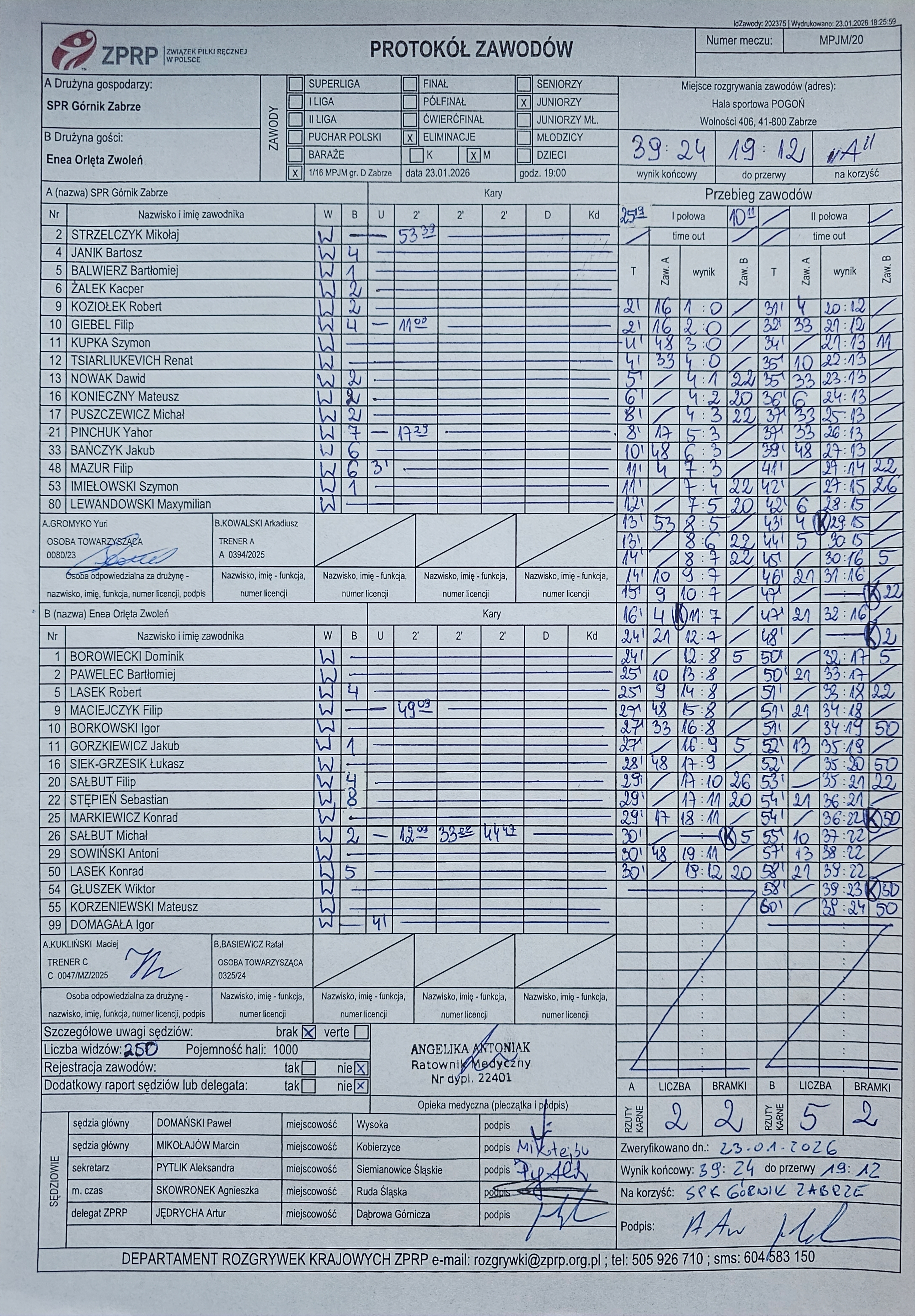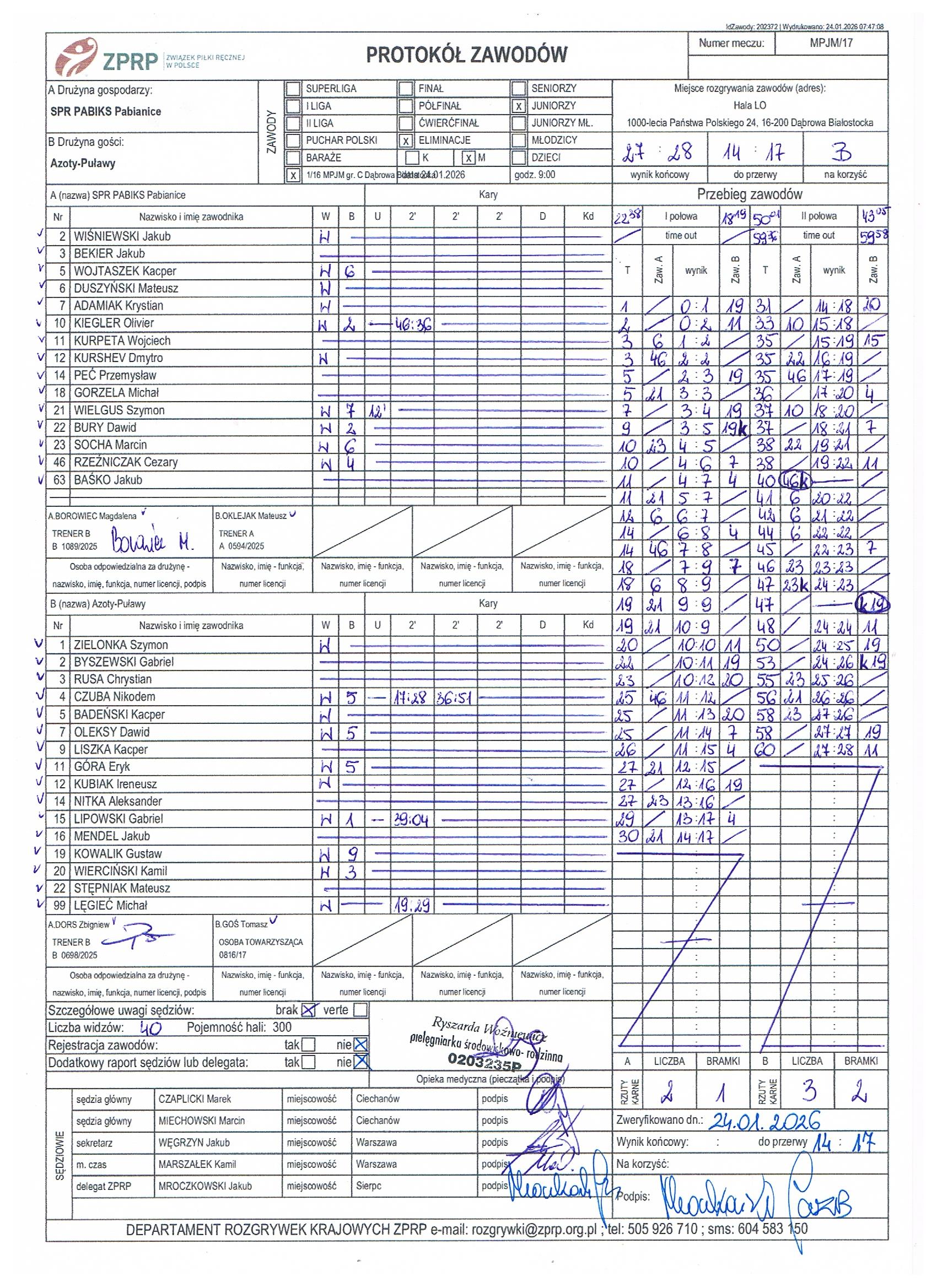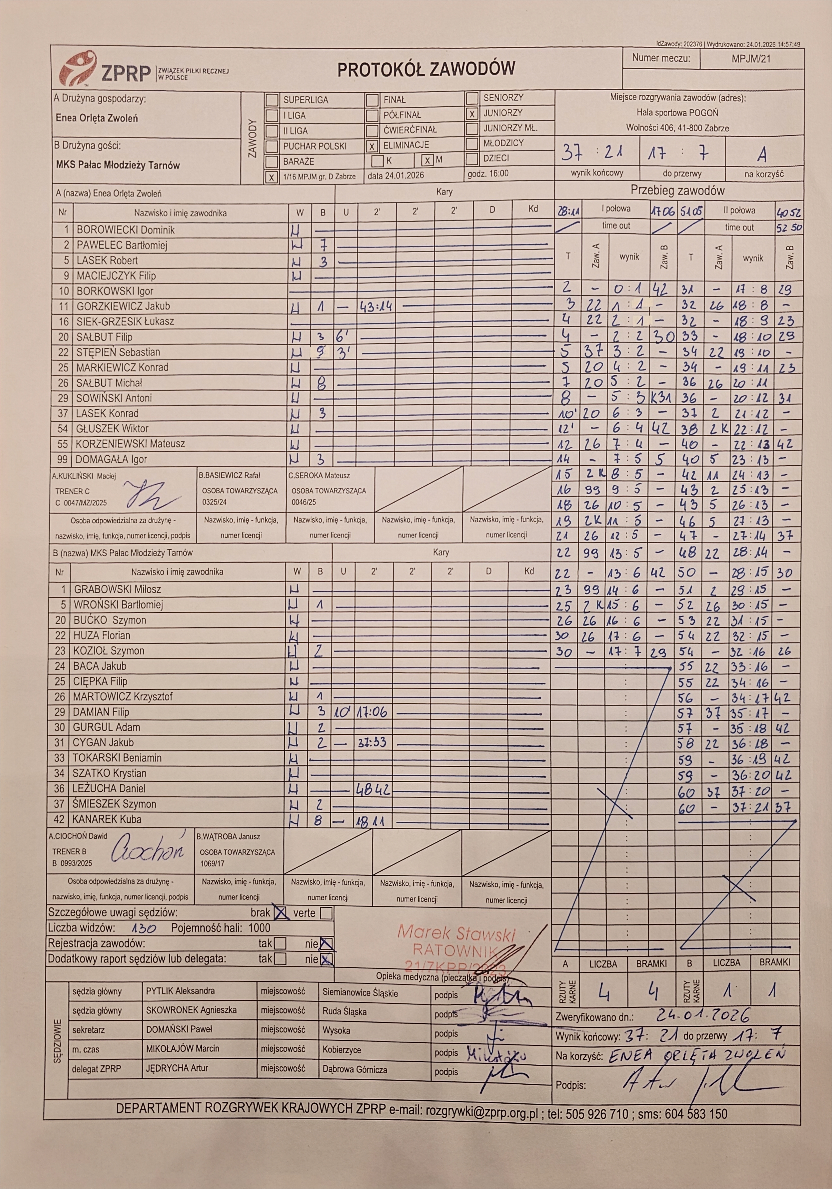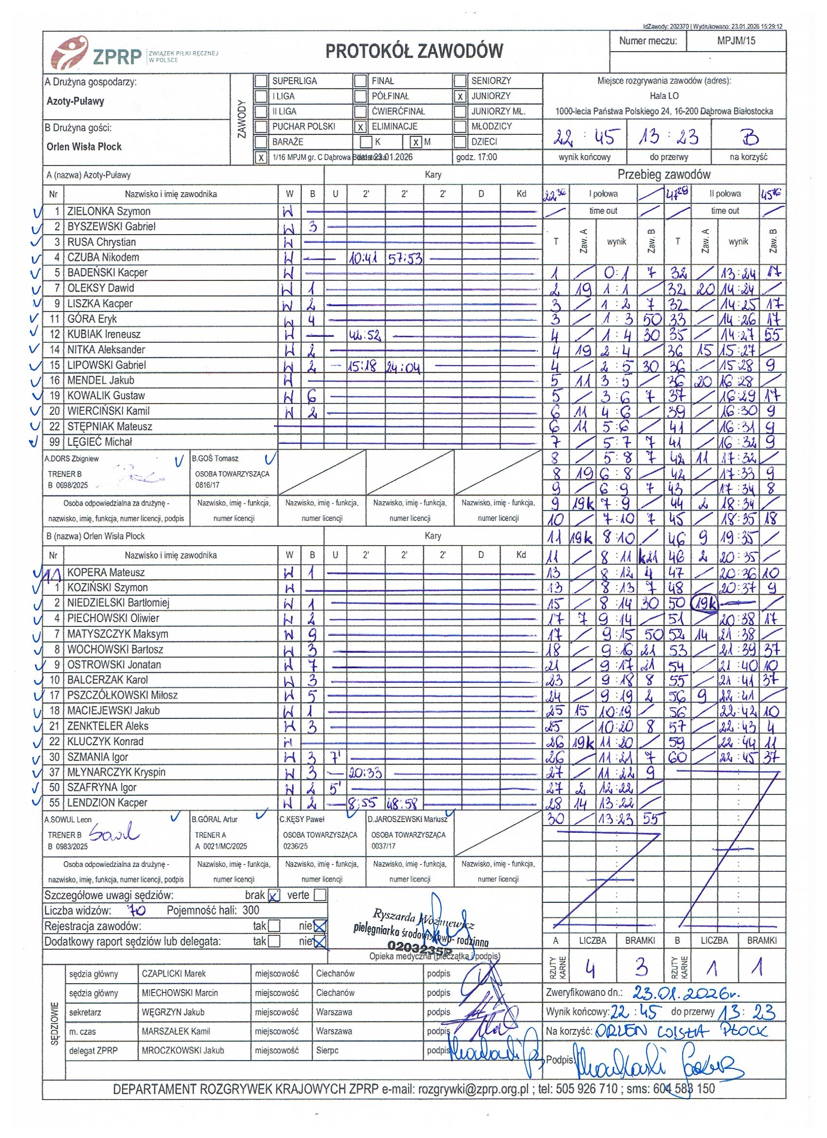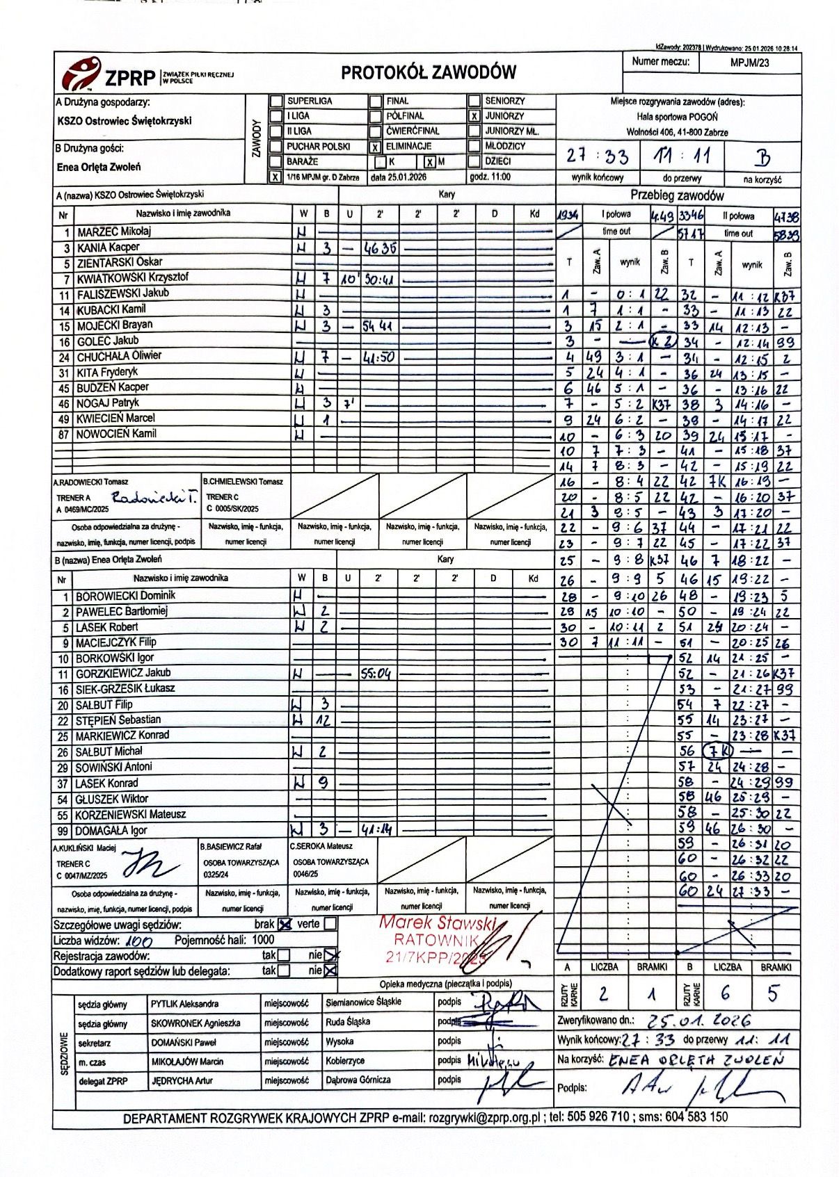 Protokół KSZO Ostrowiec Świętokrzyski - Enea Orlęta Zwoleń 27:33, wygrani grali w ośmioosobowym składzie !