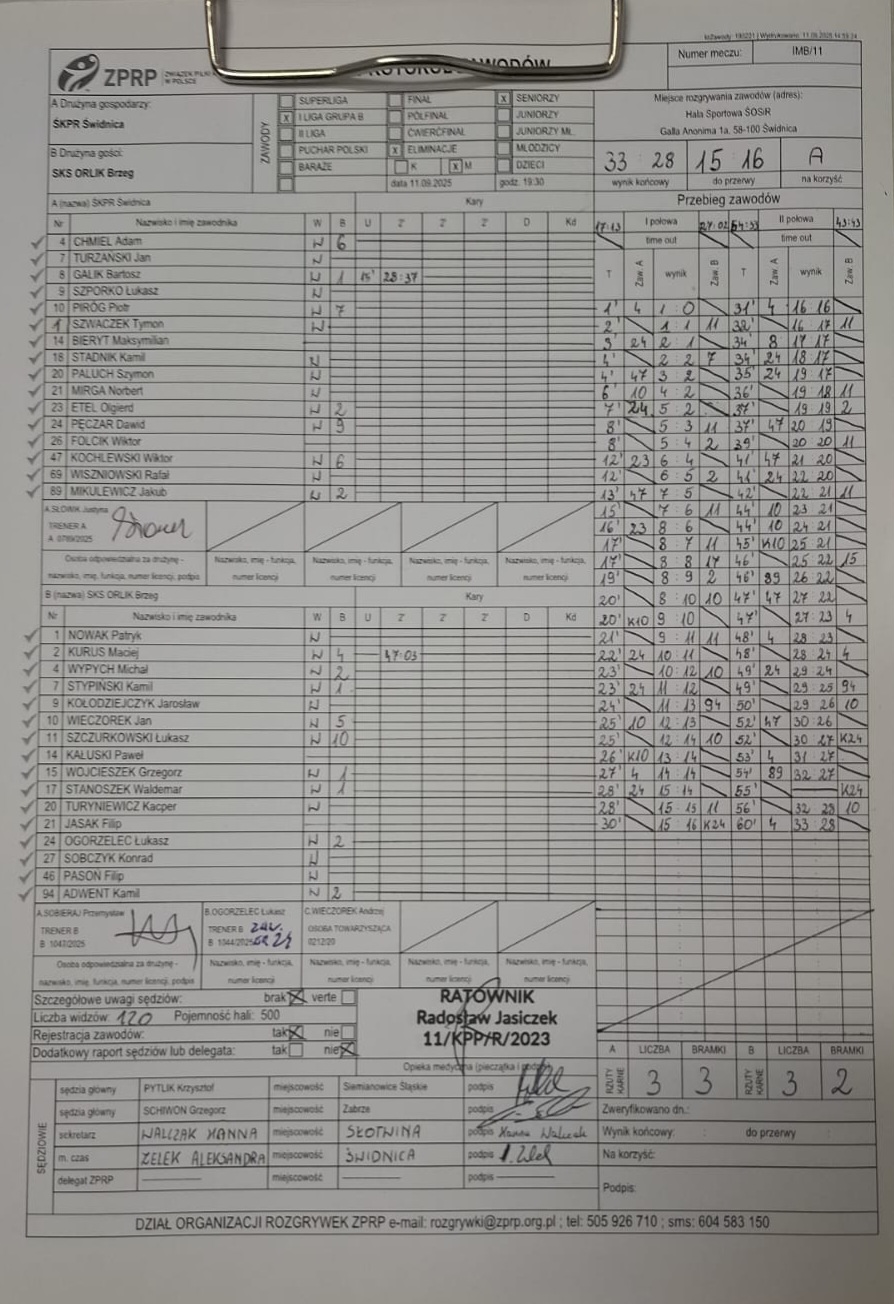 Data Kategoria Zespół 1 Wynik / Do przerwy Zespół 2 Karne1 / Karne2 Sędzia 1 Sędzia 2 16.11.2025 IMB/70 SKS ORLIK Brzeg :: UKS Trójka Nowa Sól ()() BĄZI Monika BIAŁOGRECKA Barbara 07.11.2025 IMB/57 SKS ORLIK Brzeg 21:337:14 SPR PURINA Kąty Wrocławskie 🏆 1(0)3(2) WITKOWICZ Krzysztof WITKOWICZ Radosław 25.10.2025 IMB/56 UKS Spartakus Buk 25:2610:14 SKS ORLIK Brzeg 🏆 6(3)5(1) WARELIS Kamil ZIABLICKI Tomasz 17.10.2025 IMB/44 SKS ORLIK Brzeg 26:2916:14 MKS Real-Astromal Leszno 🏆 6(4)4(1) PARKITNY Adam ZAJĄC Karol 10.10.2025 IMB/41 KPR Wolsztyniak Wolsztyn 🏆 35:3117:13 SKS ORLIK Brzeg 6(3)6(3) LIPKA Artur WALCZAK Marcin 05.10.2025 IMB/31 SKS ORLIK Brzeg 35:4713:21 ENEA WKS Grunwald Poznań II 🏆 6(6)6(5) DOMAŃSKI Paweł MIKOŁAJÓW Marcin 28.09.2025 IMB/26 SPR BÓR-JOYNEXT Oborniki Śląskie 🏆 40:3317:14 SKS ORLIK Brzeg 9(6)8(7) KLIBER Witold ZAJKIEWICZ Wiktor 18.09.2025 IMB/18 SKS ORLIK Brzeg 19:287:10 UKS Olimp Grodków 🏆 4(3)8(3) CELOCH Dawid SULISZ Mikołaj 11.09.2025 IMB/11 ŚKPR Świdnica 🏆 33:2815:16 SKS ORLIK Brzeg 3(3)3(2) PYTLIK Krzysztof SCHIWON Grzegorz 06.09.2025 IMB/5 SKS ORLIK Brzeg 25:2912:17 PGE KPR Gryfino 🏆 6(4)1(1) BORUCKI Dawid WASIAK Jakub Tabela i strzelcy – SKS Orlik Brzeg Wybierz sezon: -- wybierz sezon -- 2025/20262024/20252023/2024 Superliga mecze,strzelcy COROTOP Gwardia Opole I liga mecze,strzelcy Otmęt Krapkowice I liga mecze,strzelcy Olimp Grodków I liga mecze,strzelcy Gwardia Opole II liga mecze,strzelcy OSiR Komprachcice II liga mecze,strzelcy GTV BUS Gwardia II Opole II liga mecze,strzelcy ASPR Zawadzkie